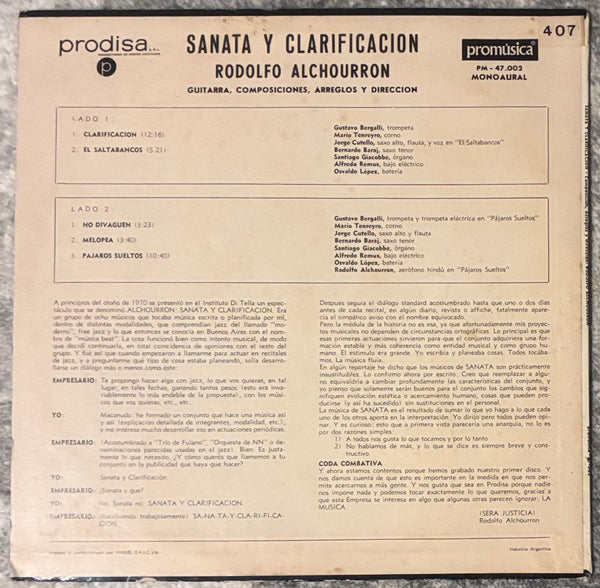 Rodolfo Alchourron, active since the dawn of Argentine jazz, is known as a composer who explored the broad spectrum of jazz expression and as one of the foremost arrangers in the scene. This work is the first project under the name Sanata Y Clarificación, which catapulted him to fame, it was formed in 1970 following a performance that fused modern jazz, free jazz, beat music. The members include talented musicians such as Alfredo Remus, Osvaldo López, Bernardo Baraj, Gustavo Bergalli. It starts with "Clarificación" a breathlessly unfolding track that seems to trap a myriad of improvisation, free, and modern elements, followed by “El Saltabancos” where elegance and groove coexist, culminating in Osvaldo López's drum solo, “No Divaguen” with its distinct organ and saxophone tones and a hint of folklore, gracefully atmospheric “Melopea” and stunningly avant and complex development featuring Rodolfo Alchourron's Hindi aerophone insane "Pajaros Sueltos". All five tracks. Insanely good.