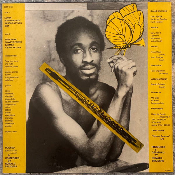 スリナム出身のオランダ人フルート/マルチプレイヤーRonald Snijdersが80年にリリースした超傑作。大量の民族楽器、シンセ、エレピ、ギター、ベース等を持ち出し全て自身の演奏によるセルフ・パフォーマンス・マルチ録音作品で、柔軟なフルートの響きに尋常でないリズム感覚、ドープネス、展開力ともはや全てを備えていると言って過言ではない構成による全8曲を収録。特に当店お気に入りはゆったりとしたスタートから神聖なムードに包まれファンクネスを高めてドラミングを加えドープにフィニッシュする”Soweto Friend”がお気に入り。全編間違いないです。自主盤とは思えないクオリティを存分に味わってみて下さい。オリジナル美盤。
