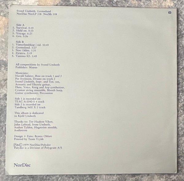 Svend Undseth, a multi-instrumentalist who is best known for member of Norwegian jazz fusion band Vanessa, and who plays saxophone, flute, clarinet, guitar, synth, etc. This is his solo debut album from 1979, which he created almost entirely through his own multi-instrumentation, with the exception of two tracks. It contains number of experimental electronic pieces that seem to liberate the ego all at once, with influences from musique concrète, German experimental music, Eno. Side A begins with free-spirited "Survival" with saxophone blasting intertwined with mysterious synths and percussion, followed by response to Germankraut (?) "Hold On", kosmische electronics piece "Voyage" that slowly takes you on a trip as if guided by a female voice, and ambient piece "Gro" that depicts a northern soundscape. Side B includes the long, and sharp electronic piece "Vinterlandskap I Tid", insane electronic "Grenseland" and dark ambient "Noe I Blått". After 1980, he began to cross over into various other fields, such as making music for movies and ballet, but he was probably one of the most cutting-edge sound creators of that period. This is also known as one of Norway's first ambient/electronic records. Rare first original in great condition.