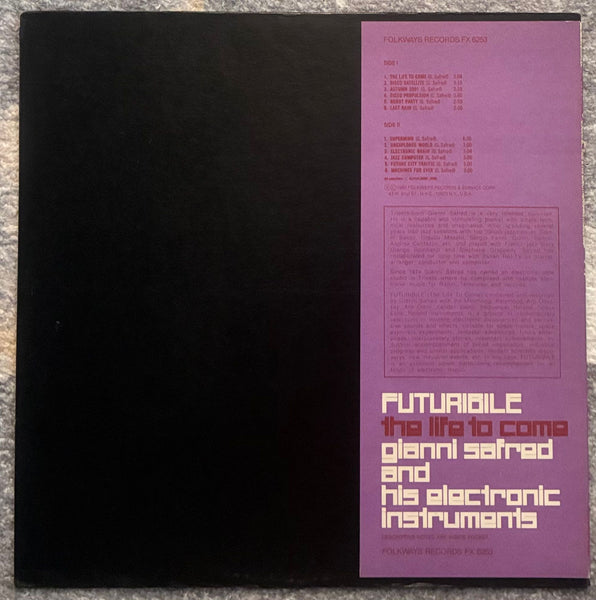 Italian composer Gianni Safred's monumental futuristic electronic album, released in 1978 and crafted using Moog and ARP synthesizers. Each track is fully realized, incorporating abstract and cosmic elements. It's also interesting that it was released by prestigious Folkways.