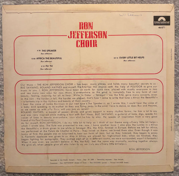 ニューヨーク出身のドラマーRon Jeffersonがパリ滞在中にリリースした65年作品。メインの活動であったRoland HaynesとBuz Savianoとのトリオ編成にて現地でも好評を得たことで、母国セネガルでのコンサートの機会から生まれたこの作品を決定づける”Africa The Beautiful”を収録。アフロジャズの原点とも言える自身で吹くフルートとセネガルの打楽器群がアクセントになりながら流麗な演奏と精神性が融合された12分を感じさせない名曲。他にもスキャットと共に立ち昇るような演奏が聴ける”The Speaker”、ダンスするようにリズミカルな演奏が心地よい”Fu Yu”、24分に及ぶ様々な側面を見せるように展開するテーマ曲”Every Little Bit Helps”を収録した隙なしの内容。ですが当時のセールスは全く振るわなかったようでその後ニューヨークへ戻ってしまったようです。それもあり現在オリジナルは入手困難となっています。あまりプレスが良くないようで静部にノイズが発生しますが良いコンディションの部類です。視聴長めに録ってありますのでご確認ください。