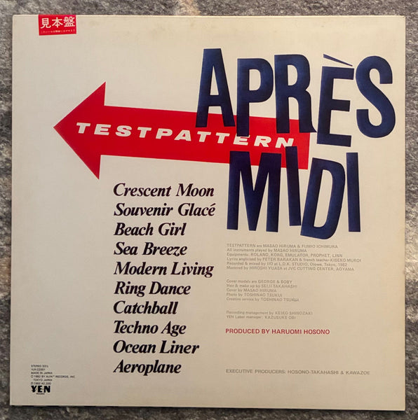 グラフィックデザイナーの比留間雅夫と市村文夫の2人によるテクノポップ・ユニットTestpatternの唯一作。デモ段階から非常にその音楽性を評価していたという細野晴臣が全面プロデュースを手掛けています。コンピレーションに収録された”Ryugu”などテクノ的イメージが先行している感もありますが、アンビエントやホームメイドミュージック的視点からも非常に優れた音楽性。ポップミュージックに通じる心地よさも感じ取れると思います。細野さん的にも後の”花に水”や”モナド観光音楽シリーズ”への道しるべになったような作風にも感じます。YENレーベル屈指の名作。稀少なプロモ盤。