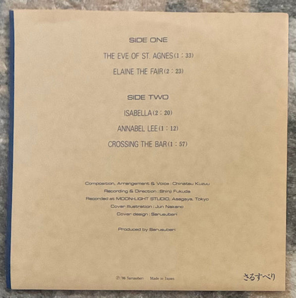 Chinatsu Kuzuu, a songwriter who sings the poetry of poets in her medieval voice with synths, and has made a big achievement in television advertisement and game/anime music industry represented by the FINAL FANTASY series. This is the latter of the two EPs released on her own label, Sarusuberi. It contains five tracks with a modern classical sound, featuring overflowing synth programming by keyboardist Shinji Fukuda and Kuzuu's vocals. "The Eve Of St. Agnes", "Elaine The Fair" and "Isabella" are particularly appealing. With rare post card.