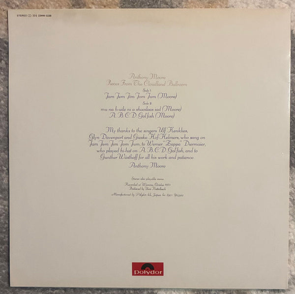 Slapp Happy前夜に奇才実験音楽家/プロデューサーAnthony Mooreがリリースしていたソロファーストアルバム。元々ケージに多大な影響を受けていた事は広く知られていますが、この作品でもA面いっぱいに鐘の音に三人のヴォーカルが歌を繰り返し時には笑い人間の生理構造とチャンス・オペレーションを用いて展開されるミニマル・ミュージック”Jam Jem Jim Jom Jum”。B面にはテープの逆回転を用いゆったりとしたアンビエント・ミニマル・ミュージックを演出した”Mu Na H-Uile Ni A Shaoileas”、煌めく電子音とアコースティックな音色が淡い表情を浮かべるように展開される”A.B.C.D. Gol'Fish”を収録。71年という時代を考えても早すぎた作品と言えると思います。82年の日本リイシュー版。