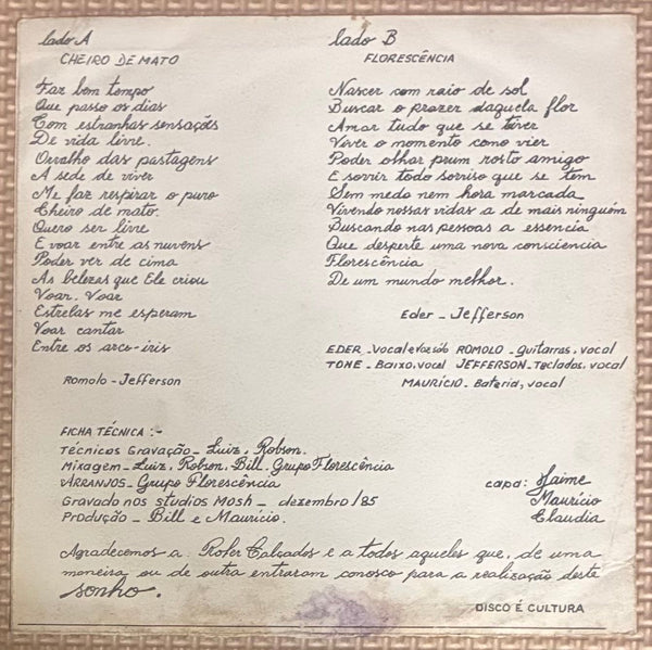 詳細不明のブラジリアン・グループGrupo Florescênciaによる85年のシングル盤。注目はB面に収録のまろやかなエレピから始まりメロウに展開していくシンセ・MPB”Florescência”がいいです。おそらくほとんど知られていない一枚。ホームメイド感あるアートワークもいい感じ。