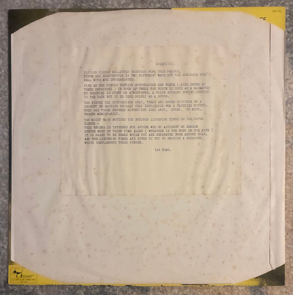 現在も多くが謎に包まれたミュージシャンIan Elmsが80年代初頭に作り上げたカルトシンセ作品。イギリス東Suffolkのスタジオにてプロデューサー/エンジニアDave Hoserと共にキーボード、ドラムトラック、シンセサイザーによって制作され、物語性を帯びた楽曲と儚い感情を表現した楽曲の全15曲。Lo-fi、ベルリンスクール、DIY、ミニマリズムの要素を満たしながら孤立主義的とも評される奇妙だがどこか心捉まれる魅力に満ちています。謎めいた歌詞もこの作品を際立たせている。「Surrounded By Trees」を表現したような黄色の森のアートワークも印象的。