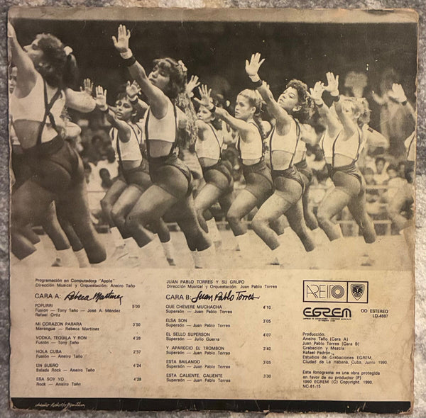 90年にキューバでリリースされたその名の通りエアロビクスの為の楽曲集。A面ではFA-5の作品等に参加し以降もグラミーを受賞するなど活躍するプロデューサーAneiro Tañoがアップルコンピュータでプログラミングを施し女性シンガーRebeca Martinezが歌う全6曲を収録。フュージョンと示されていますがモダンなアレンジが効いたニューウェーヴ的アプローチにも聞こえる”Popurri”やワイヤードなシンセ・ファンク”Esa Soy Yo”、バレアリック的バラード”Un Sueño”。対するB面にはキューバの最重要アーティストのひとりJuan Pablo Torresによるジャズファンク~アフロキューバンな楽曲を収録。優雅なメロウ・ファンク”Elsa Son”や男女コーラスのファンキー・メロウ”Y Aparecio El Trombon”含むこちらも隙なしの構成。90年という時代が生んだモダンと伝統が交差するキューバ産レコードでも特異な分類に入る内容と思います。盤面薄いマーク散見しますが再生まずまずのところ。