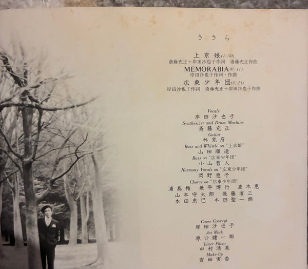 Aspirin Records, the predecessor label of Balcony records, known for the releases of Hikashu,Toshiyuki Tsuchitori, Cock C' Nell, Jagatara , this single is only and final release from Aspirin by five-piece new wave pop band Sasara. It contains three twisted tunes that feel like a stepping stone to that Balcony record, among them,oriental atmosphere of B2 "Cantonese Syonendan" is the highlight, and the psychological pattern of A side "Jyokyomusume" is also quite nice with lovely lyrics. It's not easy to find.