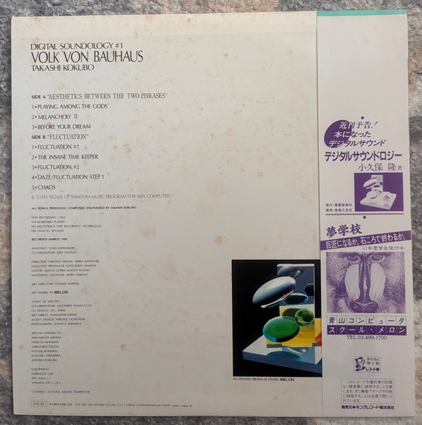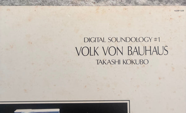 Takashi Kokubo, one of the pioneers of environmental music in Japan, and his presence has been growing in recent years as he continues his production and live performance activities. A Side has inspired by the "Bauhaus people" who gathered cutting-edge materials and produced groundbreaking creations in Germany between 1920 and 1930, and was produced without using any other keyboards or analog sounds, making full use of Fairlight CMI, which was born in Australia, a cutting-edge technology for Kokubo. It contains 3 tracks that were created through a "Picasso-like process" in which he repeatedly added and modified the sounds realized by the Fairlight CMI in a repetitive two-bar sequence. The B-side contains five experimental electronic type tracks that use random functions to generate random fluctuations. Both sides of the album feature completely different musical styles. Disc great shape, Sleeve has stains/wears.