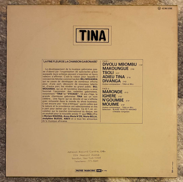 1976 release album by Tina, a female singer from Gabon, located in Central Africa, when she was just 18 years old. She blossomed into a talent at a young age, making a name for herself primarily in the world of show business, and it seems she was a household name in Gabon. It's easy to see why, as the album features numerous chansons sung with a unique vocal style accompanied by guitar. Includes “Tsoli” sung back folky atmospheric guitar tones, to “Ighere” sung slowly and deliberately in perfect sync with the guitar. The entire album is amazing. Her reverb-like voice further enhances the atmosphere. Beautiful EX copy.