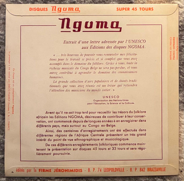 ギリシャ人実業家により48年から71年まで運営されたコンゴ川を挟んだ地域(旧ベルギー領/フランス領)のアーティストを紹介したレーベルNgoma。本作はコンゴ民主共和国の南中部地域ルバ族の2つのアーティストによる61年の7インチ盤。どちらもいいですがGroupe Bayeke Flûtistes Lulua Jazzなる楽団によるなんともいえない笛のリードに打楽器と合唱が絡む和みと哀愁を生むような原生アフロフォーク2曲が最高。反対サイドのアコーディオン奏者Kabongo Mbonkodi率いるグループによるぬるっとした2曲もいい。そしてこの目を引くアートワークが秀逸。デッドストックに近い超美品。
